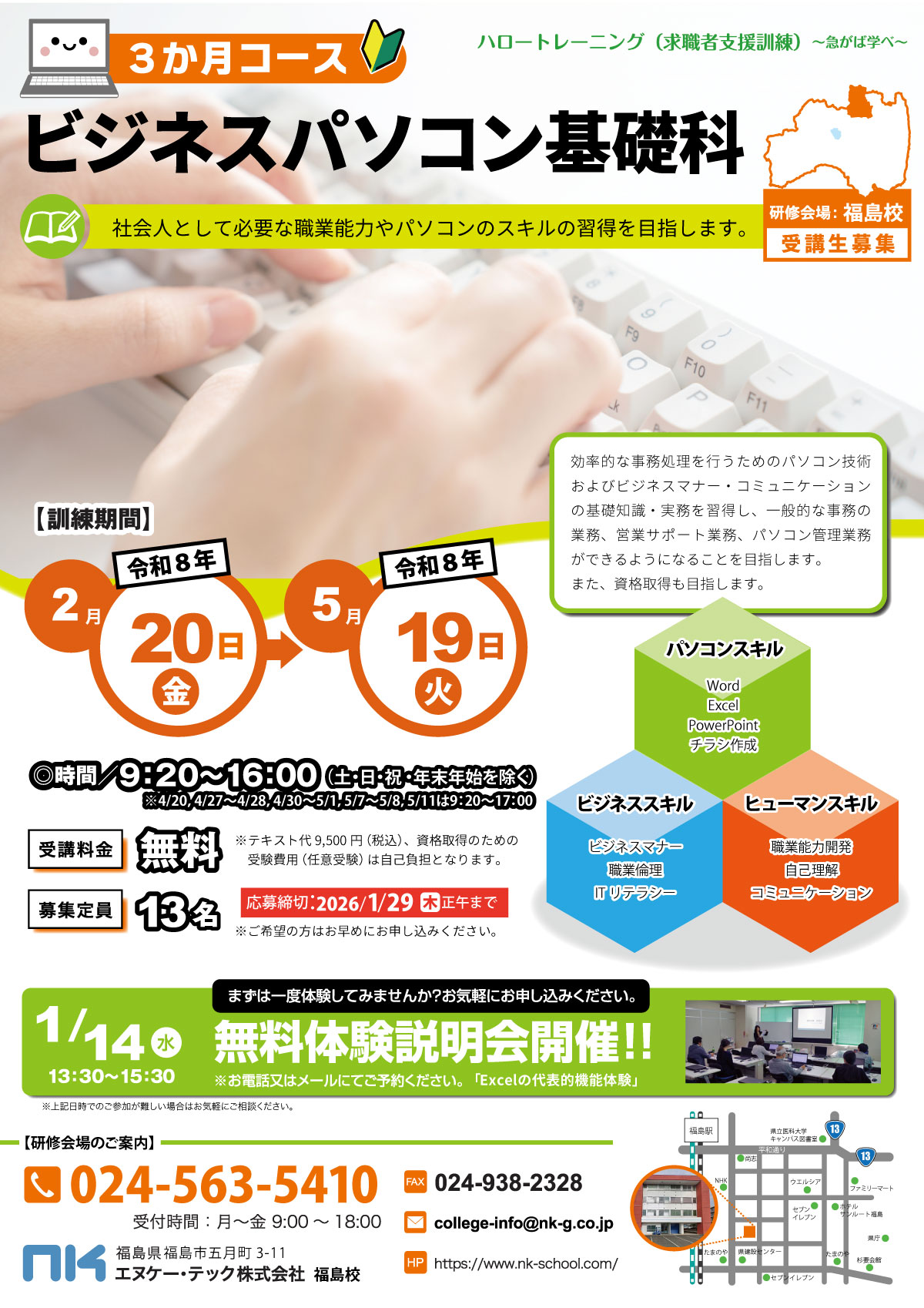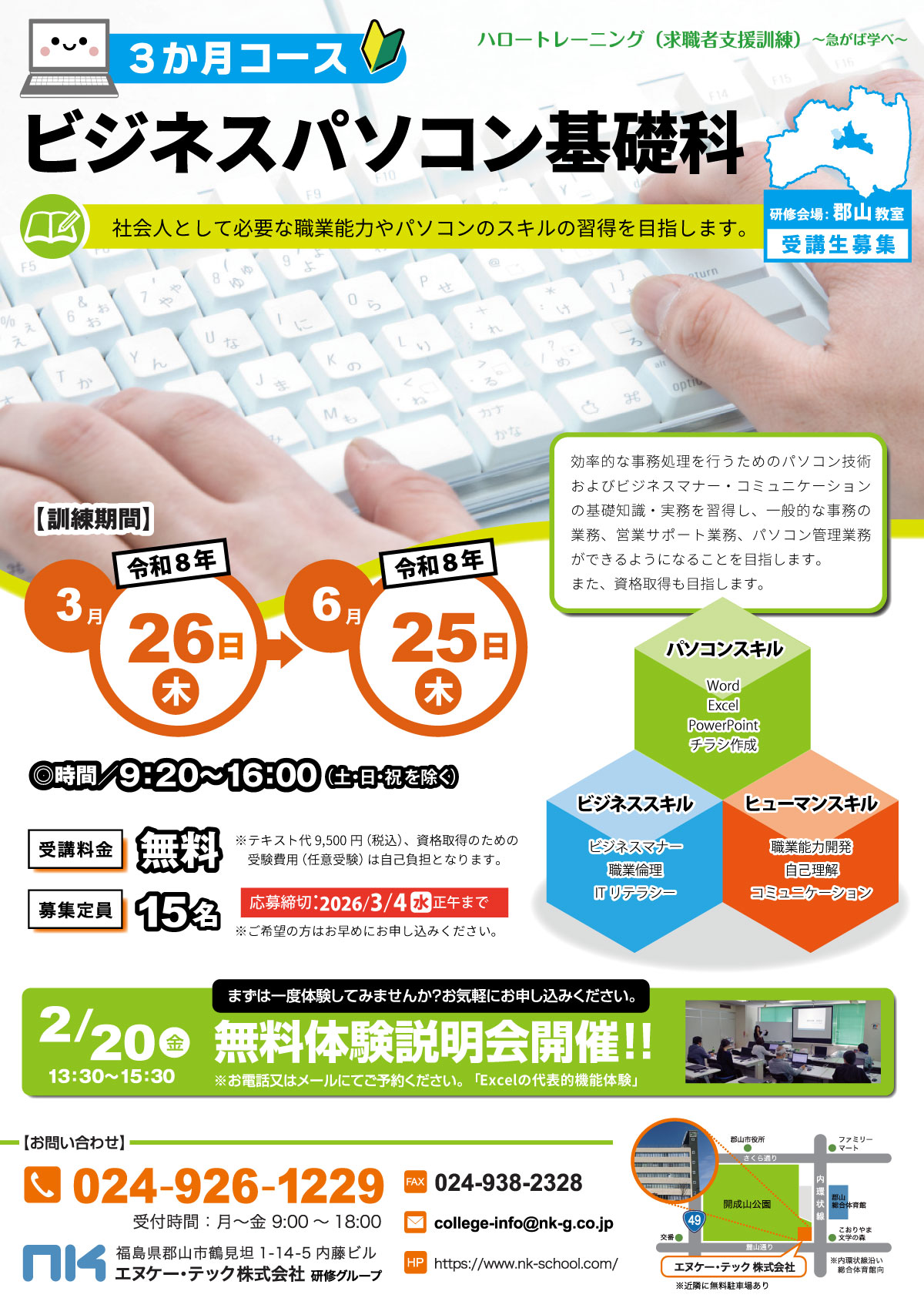 | 職業能力開発講習(ビジネステクニック) パソコン操作 | パソコンの起動・終了、キーボード操作、日本語入力、Webブラウザの操作、電子メールの操作 | 32h |