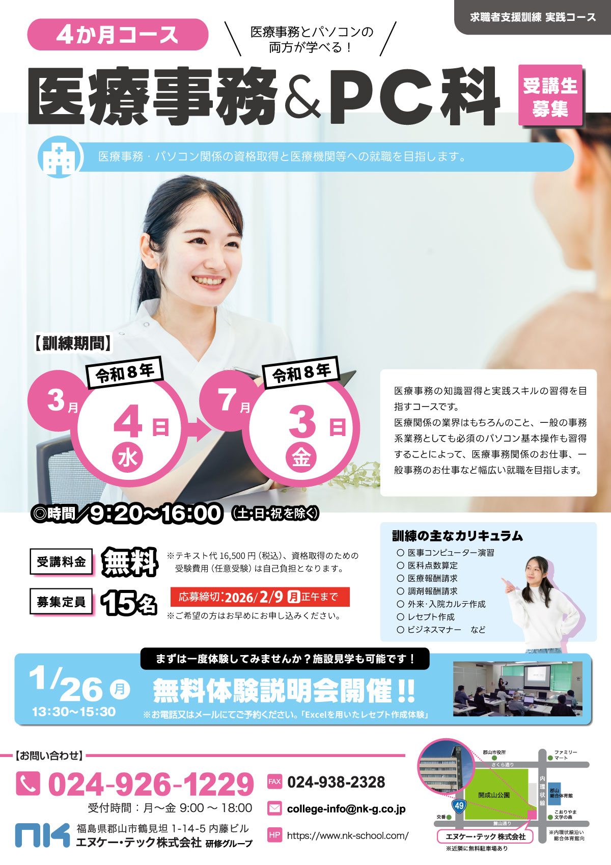 | 医療事務の知識 | 医科点数算定(診療報酬)の基礎知識(初診料~入院料など)、医科実務症例、点数算定、レセプト(診療報酬明細)の記載のしかた | 45h |